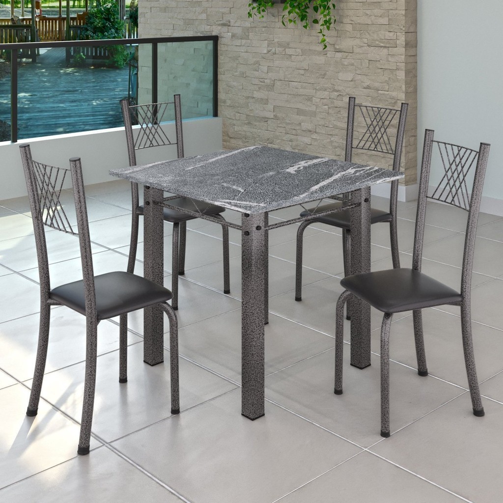 Conjunto de Jantar Mesa 70x70cm Tampo de Granito Topázio com 4 Cadeiras Sara Yescasa Preto Liso/Mart Prata