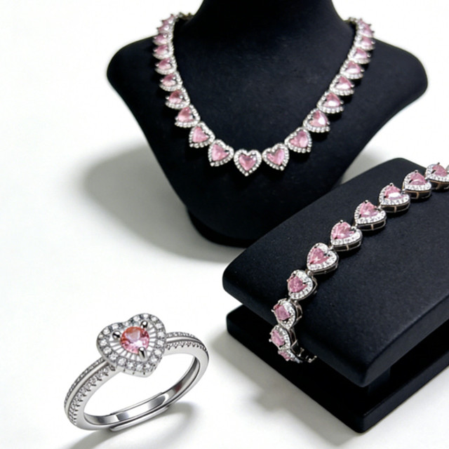 Conjunto de Joias 3 Peças Coração Rosa Zircônia Brilhante , Colar + Pulseira + Anel Banhado a Prata