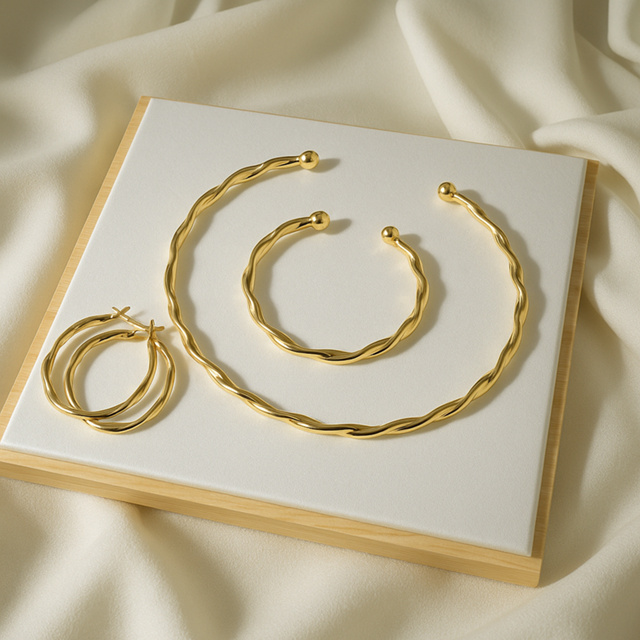 Conjunto de Joias Banhadas a Ouro e Prata – Colar, Pulseira e Brincos de Argola Torcidos