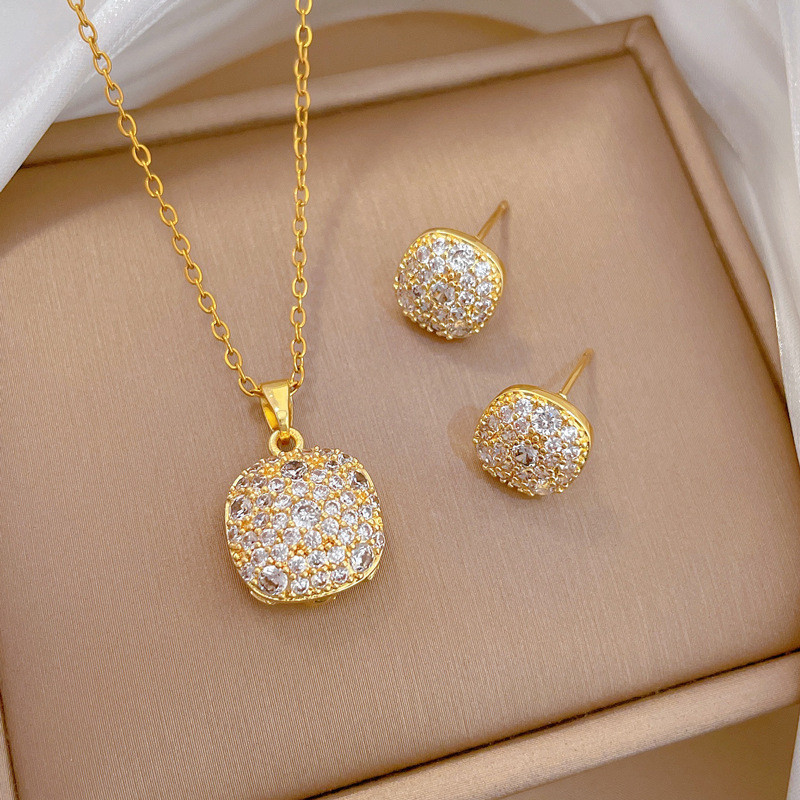 Conjunto de Joias Dourado em Aço Inoxidável - Pingente e Brincos Quadrados com Strass Brilhantes - Presente Luxuoso