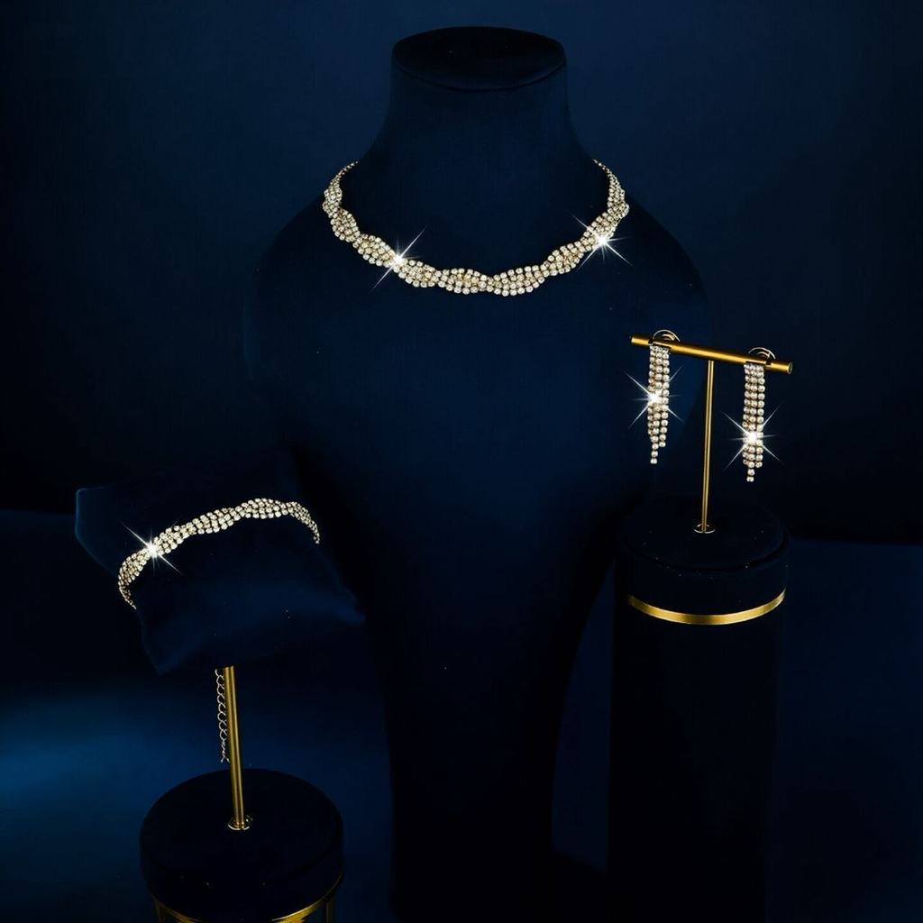 Conjunto de Joias Femininas Strass Colar Brincos Pulseira Elegante Presente Festa