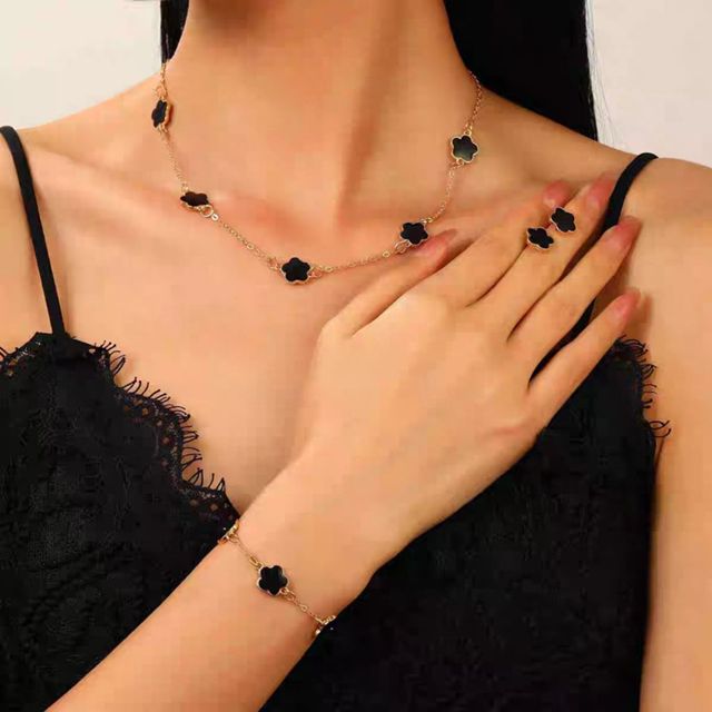 Conjunto de Joias Femininas Trevo Preto Colar Pulseira Anel Dourado Elegante Moda
