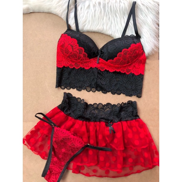 Conjunto de Lingerie 3 Peças - Trio Sutiã + Calcinha + Sainha
