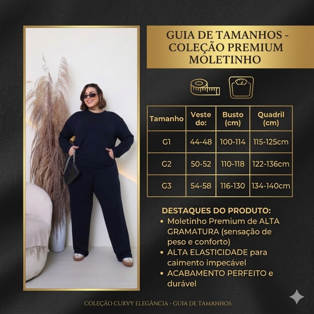 Sinta a exclusividade de um conjunto desenvolvido para valorizar suas curvas com elegância e o máximo conforto. Nosso conjunto é confeccionado em moletinho premium de alta gramatura, garantindo uma peça encorpada, com caimento impecável e que não marca. A alta elasticidade do tecido permite total liberdade de movimento, mantendo a estrutura e a sofisticação o dia todo. POR QUE VOCÊ VAI AMAR? Tecido Premium: Moletinho encorpado (alta gramatura) com toque aveludado. Blusa Manga Longa: Possui punhos ajustados e o prático bolso canguru, unindo estilo e funcionalidade. Calça Pantalona: Modelagem ampla e fluida com bolso faca, que alonga a silhueta e traz um ar chique ao visual. Versatilidade: Perfeito para compor looks desde o casual chic com tênis até uma produção mais executiva com salto. FICHA TÉCNICA Tecido: Moletinho de Luxo (Composição com alta elasticidade). Transparência: Zero (Tecido grosso de alta qualidade). Grade de Tamanhos: G1 ao G3 (Veste do 44 ao 58). Conjunto Moletinho Plus Size, Moda Curvy Luxo, Conjunto Feminino Inverno 2026, Calça Pantalona Tamanho Grande, Blusa Manga Longa Plus, Moletinho Alta Gramatura, Roupa Feminina Premium, Conjunto Preto Chique, Moda Inclusiva, Look Confortável Feminino, Brasilcore, Conjunto Moletinho Com Elastano, Roupa Que Não Marca, Conjunto Pantalona e Canguru, Moda Feminina G1 G2 G3. Conjunto Moletinho Plus Size, Conjunto Feminino Luxo, Calça Pantalona Plus Size, Blusa Manga Longa Com Punho, Bolso Canguru, Moletinho Alta Gramatura, Conjunto Moletinho Premium, Look Casual Chic, Roupa Plus Size 2026, Tecido Que Não Marca, Conjunto Confortável Feminino, Moda Curvy Elegante, Conjunto Preto Feminino, Moletinho Com Elastano, Roupa Feminina Tamanho Grande, Lançamento Plus Size, Conjunto Pantalona e Blusa, Moda Inclusiva, Look Inverno Feminino, Conjunto Versátil.