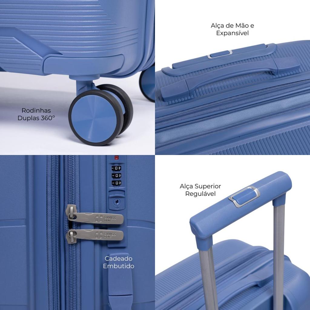 Viaje com praticidade e segurança com o Conjunto de Malas Barcelona P, M e G, produzido em polipropileno (PP) — material leve, flexível e resistente a impactos. Esse conjunto garante durabilidade, conforto e estilo em qualquer destino. Cada mala possui cadeado embutido com senha, 4 rodas duplas 360° para mobilidade suave, além de alça superior e lateral e pés de apoio que tornam o manuseio mais confortável e estável. O modelo é expansível, proporcionando capacidade adicional sempre que necessário. O interior espaçoso e funcional conta com 2 bolsos com zíper e cinta elástica com trava, mantendo roupas e acessórios sempre organizados. Espaçosa, moderna e resistente, a Mala Swiss Move Barcelona é a escolha perfeita para quem busca conforto, praticidade e segurança em cada viagem.