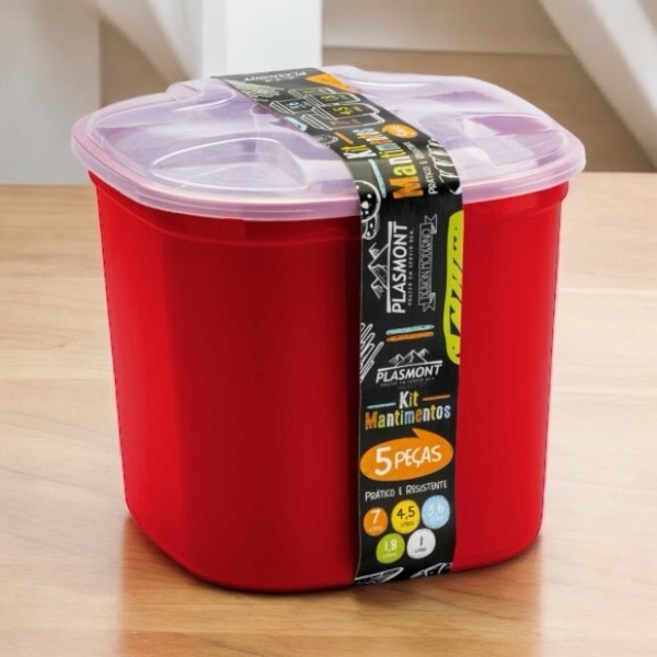 Porta Mantimento 5 Peças – Organização e Praticidade para Sua Cozinha Conjunto ideal para manter seus alimentos bem armazenados e sua cozinha sempre organizada. Com 5 potes de tamanhos variados, o kit atende diferentes necessidades do dia a dia, seja para grãos, farináceos ou outros mantimentos. Design moderno, empilhável e fácil de limpar. Especificações: Pote 1 Litro Altura: 11,8 cm Largura: 12,5 cm Comprimento: 12,5 cm Pote 1,8 Litros Altura: 14,5 cm Largura: 15 cm Comprimento: 15 cm Pote 3,6 Litros Altura: 18 cm Largura: 17,5 cm Comprimento: 17,5 cm Pote 4,5 Litros Altura: 19,3 cm Largura: 19,5 cm Comprimento: 19,5 cm Pote 7 Litros Altura: 21,3 cm Largura: 23 cm Comprimento: 23 cm Cores: Vermelho, Azul, Preto e Transparente A loja envia sempre em até 1 dia útil. Estamos à disposição para tirar qualquer dúvida via chat.