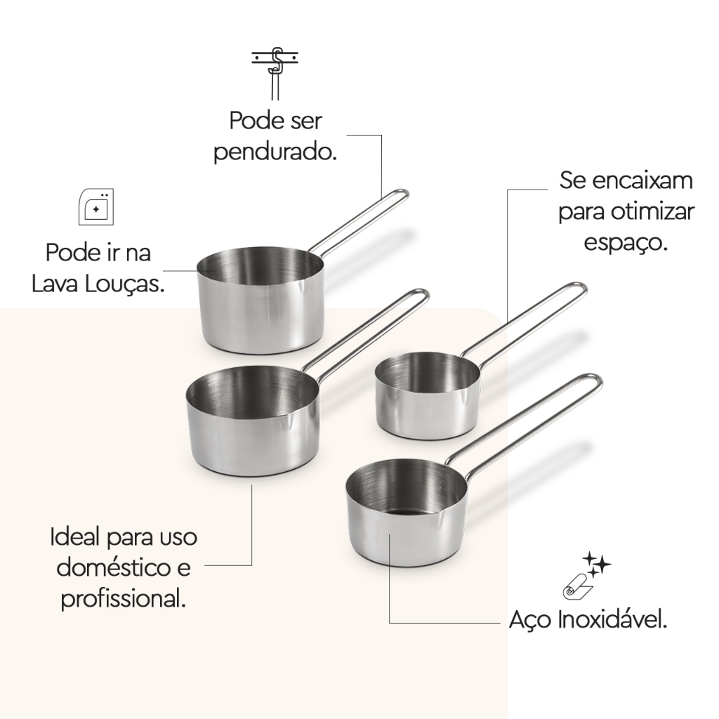 O "Conjunto de Medidores Brinox Top Pratic 4 peças Aço Inox" é uma opção prática e precisa para medir ingredientes em suas receitas. Aqui estão algumas características e informações sobre este conjunto: - Material: O conjunto é totalmente fabricado em aço inoxidável, proporcionando maior firmeza e durabilidade ao produto. O aço inoxidável é conhecido por sua resistência à corrosão e durabilidade. - Medidores e Capacidades: 1. Medidor 1 xícara (250 ml): Dimensões - 17 cm x 8,5 cm x 4,5 cm, Peso - 78g. 2. Medidor 1/2 xícara (125 ml): Dimensões - 15,8 cm x 7,5 cm x 3,8 cm. 3. Medidor 1/3 xícara (80 ml): Dimensões - 14,5 cm x 6,5 cm x 3,2 cm. 4. Medidor 1/4 xícara (60 ml): Dimensões - 14,2 cm x 5,8 cm x 2,8 cm. - Versatilidade de Uso: Os medidores são adequados para uso tanto em confeitaria quanto em culinária, oferecendo medidas precisas para uma variedade de ingredientes. - Fácil Limpeza: O conjunto pode ser limpo de maneira fácil e conveniente, sendo compatível com lava-louças. Este conjunto de medidores é uma adição útil para a sua cozinha, proporcionando exatidão nas medidas e durabilidade ao longo do tempo.