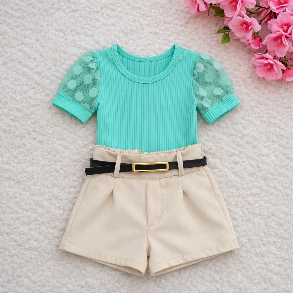 Conjunto de menina blusa + short e cinto infantil primavera verão