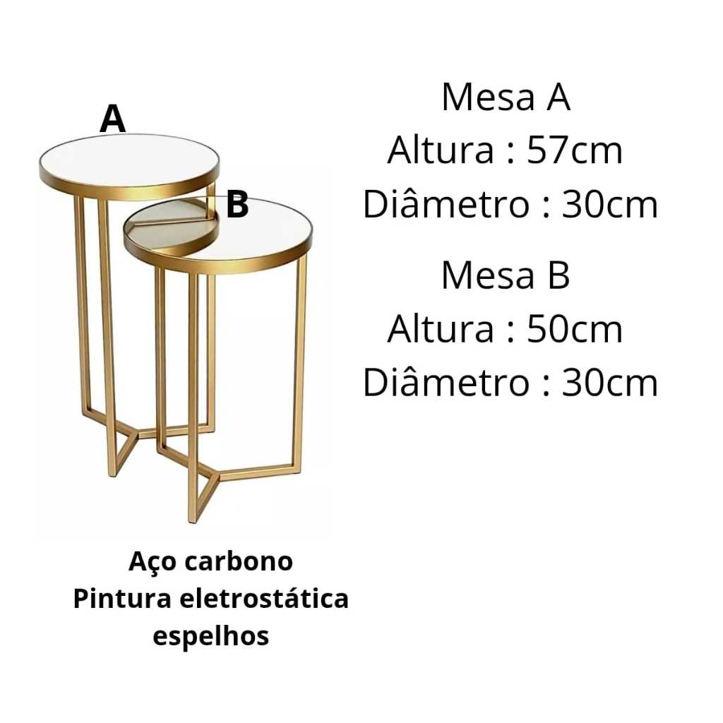 Este conjunto inclui 2 mesas laterais, sendo elas: 1 mesinha média medindo 57 cm altura x 30 cm largura (diâmetro) 1 mesinha baixa medindo 50 cm altura x 30 cm largura (diâmetro) * Material da estrutura: Ferro / Pintura Eletrostatica * Cores disponíveis: Dourado * Superfície do Tampo: Espelho Vantagens de comprar conosco: - EMBALAGEM: Trabalhamos com um sistema de embalagem muito reforçado, feito com muito carinho e dedicação! - ENVIOS: Nossos envios são efetuados em menos de 24 horas após a confirmação da compra! - ATENDIMENTO PÓS COMPRA: Temos uma equipe especializada e dedicada em atendimento pós venda! Qualquer dúvida entre em contato pela caixa de mensagens, será um prazer lhe ajudar com suas duvidas!