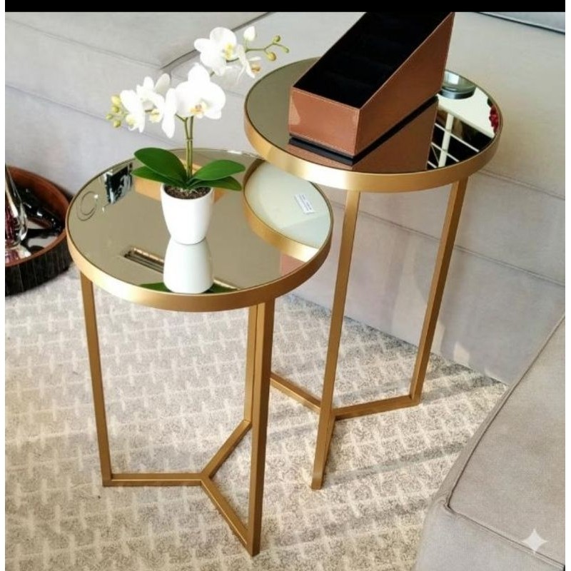 Este conjunto inclui 2 mesas laterais,sendo elas: 1 mesa média medindo 57 cm altura X 30 cm largura (diâmetro) 1 mesa baixa medindo 50 cm altura X 30 cm largura (diâmetro) * Material de estrutura: Ferro/ pintura eletrostática *Cores disponíveis: Dourado e Preto * superfície do Tampo:espelho Vantagens de comprar conosco: -EMBALAGEM: Trabalhamos com um sistema de embalagem muito reforçado, feito com muito carinho e dedicação!