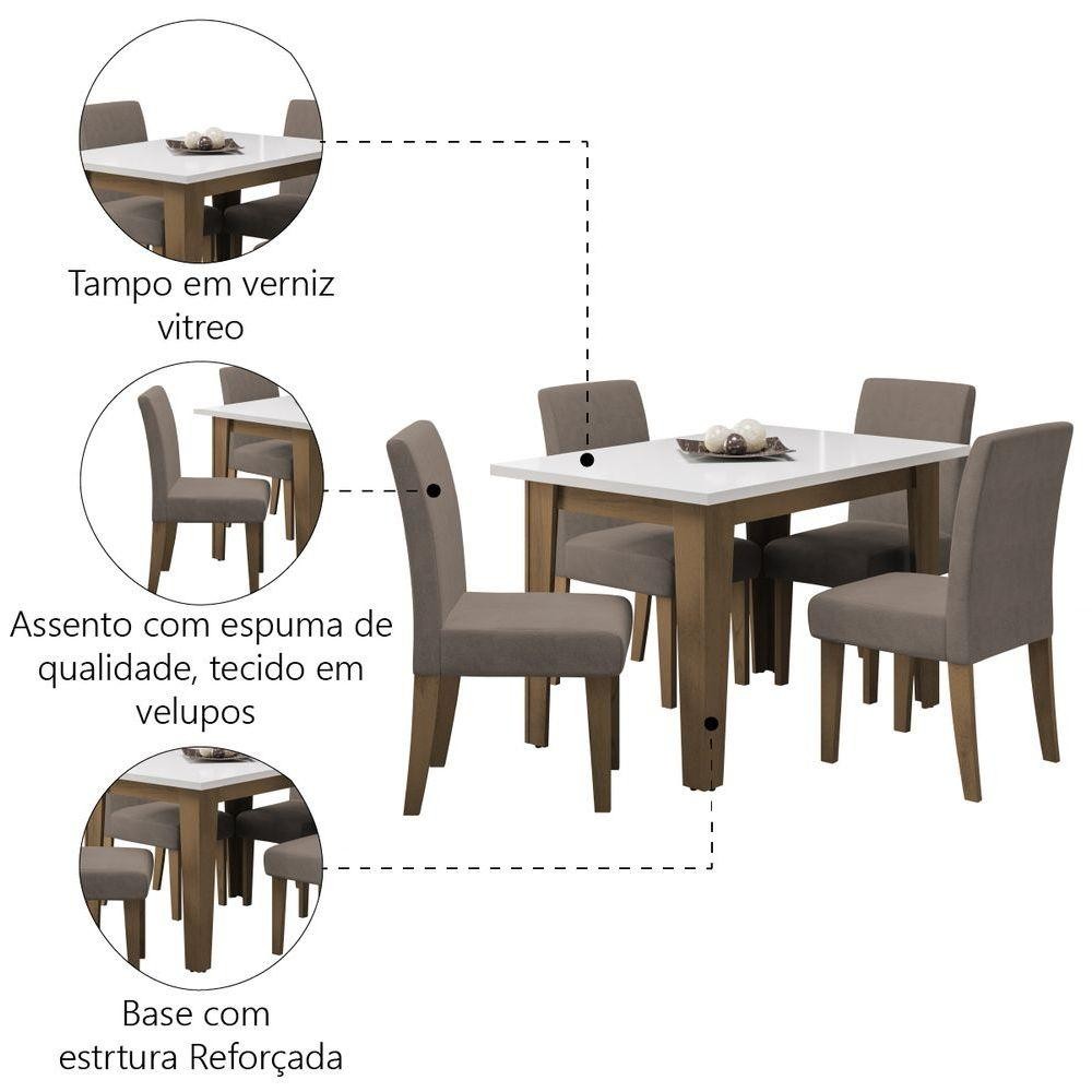 Conjunto De Mesa Sala De Jantar Miami Com 4 Cadeiras Trieste Suede 1,20m Cedro / Off White / Mascavo Dobuê Castanho/branco O Conjunto de Mesa Miami 1,20m com 4 cadeiras é perfeito para compor sua cozinha, Sala de Jantar ou área gourmet. A mesa possui acabamento em verniz Vitreo, que forma uma camada transparente de alta resistência que garante maior qualidade ao produto. As cadeiras são revestidas em tecido Veloplus macia e confortável na cor Mascavo. Excelente para receber os amigos e familiares, tornando o momento ainda mais especial! MODELO: Conjunto de Mesa Sala de Jantar Miami com 4 Cadeiras Trieste Suede 1,20m Dobuê MARCA: Dobuê COR DA MESA = Estrutura: Cedro / Tampo: Off White COR DA CADEIRA: Estrutura: Cedro / Assento: Mascavo MEDIDAS: Medidas Mesa: [ A ] = 78 cm [ L ] = 80 cm [ P ] = 120 cm Medidas Cadeiras: [ A ] = 93 cm [ L ] = 42 cm [ P ] = 61 cm ESTRUTURA: MDP / MDF 15mm e 25 mm ACABAMENTO: Pintura UV TECIDO DA CADEIRA: Veloplus REVESTIMENTO INTERIOR CADEIRA: Espuma D20 assento e D13 Encosto MATERIAL DO TAMPO: MDP 27 mm ACABAMENTO DO TAMPO: Em Verniz Vitreo PESO MESA: 22,50Kg PESO CADEIRA: 7,40Kg SAPATAS: Plástica SISTEMA DE MONTAGEM: Parafusos, porcas cilíndricas PESO SUPORTADO MESA: 40 Kg PESO SUPORTADO CADEIRA: 110 Kg ITENS INCLUSOS: 1 Mesa e 4 cadeiras GARANTIA: 3 meses pelo fabricante AVISO:A Esplanada Móveis se responsabiliza pela entrega dos produtos adquiridos até a porta de entrada ou portaria do endereço indicado, se a portaria do condomínio permitir, as entregas são efetuadas no piso térreo e é de responsabilidade do cliente a locomoção da mercadoria até seu apartamento ou casa. Confira as dimensões do produto e certifique-se de que estão adequadas aos elevadores, portas e corredores do local da entrega. Não fazemos a montagem, desmontagem do produto e/ou portas e janelas, transporte pela escada ou içamento pelo lado de fora do prédio. Não está incluso no serviço de entrega o deslocamento até o interior do apartamento, com ou sem elevador, ou deslocamento em locais de difícil acesso como escadarias. MODELO:: Conjunto de Mesa Sala de Jantar Miami com 4 Cadeiras Trieste Suede 1,20m Dobuê | MARCA:: Dobuê | COR DA MESA:: Estrutura: Cedro / Tampo: Off White | COR DA CADEIRA:: Estrutura: Cedro / Assento: Mascavo | MEDIDAS:: Medidas Mesa: [ A ] = 78 cm [ L ] = 80 cm [ P ] = 120 cm Medidas Cadeiras: [ A ] = 93 cm [ L ] = 42 cm [ P ] = 61 cm | ESTRUTURA:: MDP / MDF 15mm e 25 mm | ACABAMENTO:: Pintura UV | TECIDO DA CADEIRA:: Veloplus | REVESTIMENTO INTERIOR CADEIRA:: Espuma D20 assento e D13 Encosto | MATERIAL DO TAMPO:: MDP 27 mm | ACABAMENTO DO TAMPO:: Em Verniz Vitreo | PESO MESA:: 22,50Kg | PESO CADEIRA:: 7,40Kg | SAPATAS:: Plástica | SISTEMA DE MONTAGEM:: Parafusos, porcas cilíndricas | PESO SUPORTADO MESA:: 40 Kg | PESO SUPORTADO CADEIRA:: 110 Kg | ITENS INCLUSOS:: 1 Mesa e 4 cadeiras | GARANTIA:: 3 meses pelo fabricante | AVISO:: A Esplanada Móveis se responsabiliza pela entrega dos produtos adquiridos até a porta de entrada ou portaria do endereço indicado, se a portaria do condomínio permitir, as entregas são efetuadas no piso térreo é de responsabilidade do cliente. Cor: Castanho/Branco