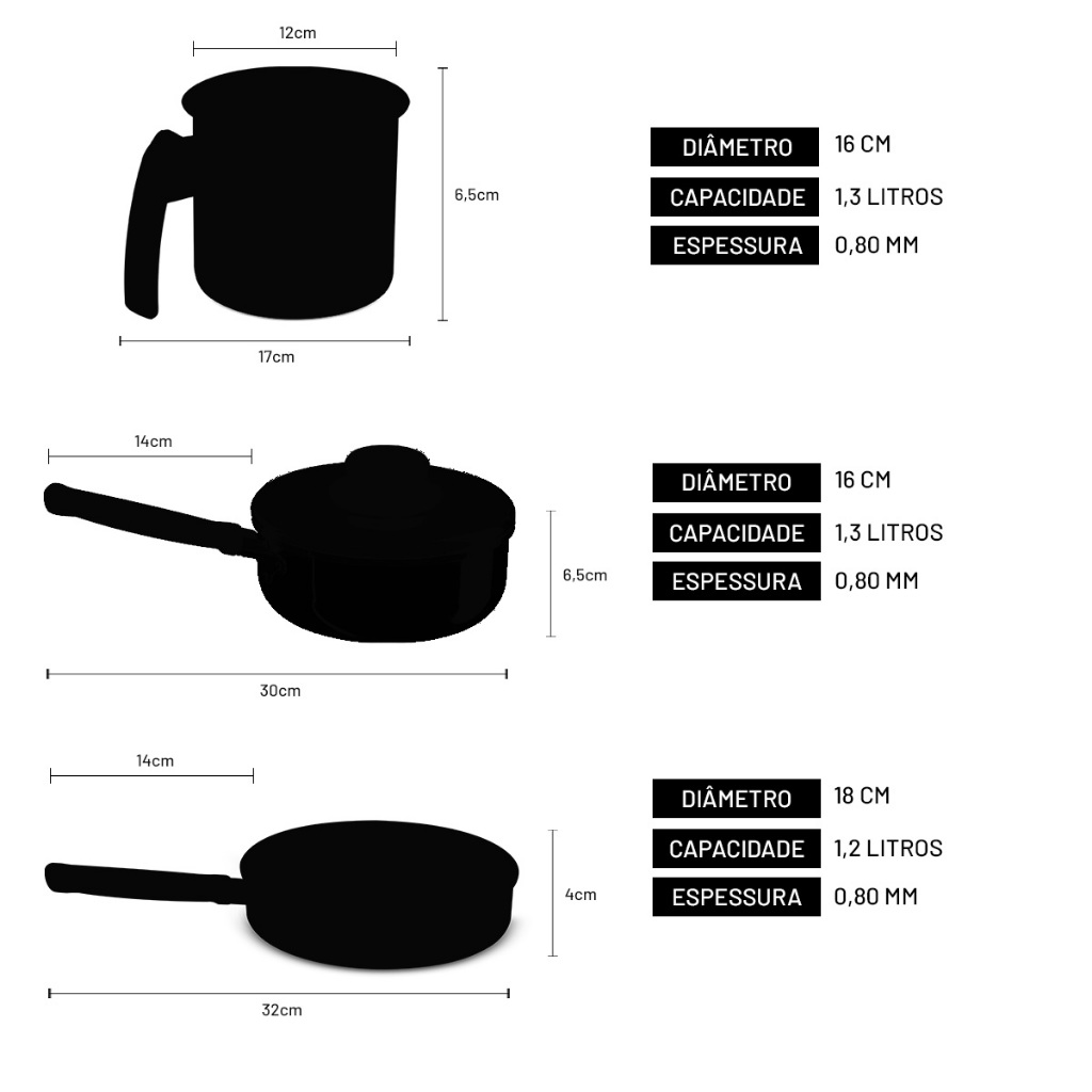 **COMPOSIÇÃO** 1 panela Pratik Lar Nº 16: 16 cm (diâmetro) – Capacidade – 1,30 L 1 frigideira Pratik Lar Nº 18: 18 cm (diâmetro) – Capacidade – 1,20 L 1 canecão Pratik Lar Nº 12: 12 cm (diâmetro) – Capacidade – 1,30 L ** ESPECIFIÇÕES TÉCNICAS DO PRODUTO** Liga de Alumínio certificada; Cabos de Baquelite; Acabamento Polido; Produto de qualidade. **UTILIZAÇÃO DO PRODUTO** Cozinhar / Fritar / Ferver. **CUIDADOS ANTES DO USO E CONSERVAÇÃO DO PRODUTO** Remova a etiqueta e lave para retirar possíveis excessos de resíduos de fabricação; Alimentos como sal, alho e molho de tomate, quando ficam muito tempo em contato com o utensílio podem ocasionar manchas e corrosão. ** SEGURANÇA NO USO DO PRODUTO** Não deixe os cabos virados para fora do fogão; A chama não deve ultrapassar a base da peça; Utilize luvas térmicas no manuseio de utensílios quentes; Produto para uso doméstico em fogão a gás. ** GARANTIA*** Garantia em casos de defeitos de fabricação. **ENVIO** Envio imediato; Produtos em estoque a pronta entrega. ** PRAZO DE ENTREGA E VALOR DO FRETE** O prazo de entrega varia de acordo com o CEP do destino; Consultar o prazo de entrega e o valor do frete direto no link do produto. **IMPORTANTE** Antes de comprar, certifique-se de que seus dados estejam corretos, pois serão com eles que concluiremos a venda; Tire todas as dúvidas no campo de Perguntas e Respostas abaixo antes de finalizar a compra. SERÁ UM PRAZER ATENDE-LOS