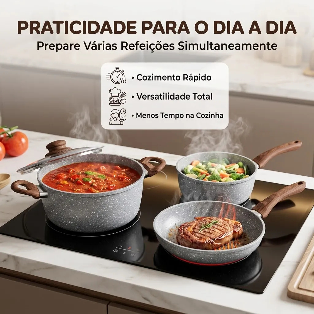 O Jogo de Panelas Indução Cerâmica 8 Peças oferece elegância e funcionalidade máxima para sua cozinha moderna. Com estrutura robusta em alumínio, revestimento cerâmico antiaderente e compatibilidade total com todos os tipos de fogão, incluindo indução, transforma o preparo de alimentos em uma experiência prática e saudável. Alças Soft-Touch e tampas de vidro temperado garantem segurança e conforto em cada uso. Revestimento e Tecnologia Antiaderente 🛡️ Revestimento interno em cerâmica de altíssimo poder antiaderente 🚫 Alimentos não grudam na superfície 🧼 Limpeza facilitada sem esforço 💚 Permite cozimento com mínimo de óleo Estrutura e Materiais 🥘 Alumínio robusto com revestimento em cerâmica 🔥 Cozimento rápido, uniforme e altamente eficiente 🤲 Cabos e alças em baquelite com acabamento Soft-Touch 🌡️ Não esquentam durante o uso Composição do Conjunto 🍲 Caçarola 24cm (4,5L) com tampa de vidro 🥘 Caçarola 20cm (2,5L) com tampa de vidro 🍲 Panela 20cm (1,8L) com tampa de vidro 🍲 Panela 16cm (1,4L) com tampa de vidro 🍳 Frigideira 24cm (1,3L) 👨🍳 1 Colher de Nylon 32 cm 👨🍳 1 Concha de Nylon 32 cm 👨🍳 1 Espátula de Nylon 32 cm Compatibilidade e Uso 🔥 Funciona em todos os fogões: gás, elétricos e indução 🧲 Fundo magnético especial para cooktops de indução 🧼 Compatível com máquina de lavar louças 💧 Limpeza prática e sem complicações Tampas e Segurança 🪟 Vidro temperado para acompanhamento do cozimento 🛡️ Bordas em silicone que vedam perfeitamente 🔒 Evitam atritos com o revestimento ✅ Fechamento seguro e eficiente Design e Sofisticação 🎨 Tom vermelho vibrante que transforma o ambiente ✨ Design moderno e elegante 🏠 Se adapta perfeitamente a qualquer cozinha 💎 Acabamento sofisticado e refinado Praticidade e Eficiência ⚡ Otimiza tempo na cozinha 🎯 Conjunto versátil para diferentes tipos de preparo 👨🍳 Eleva a arte de cozinhar 🏆 Solução completa e funcional