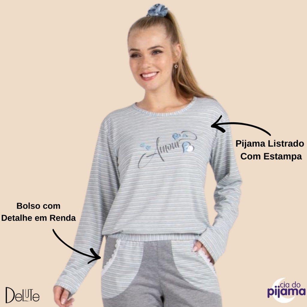 Pijama Estampado Com Bolso Cia do Corpo Ref: 4884 e 4878 **Nao Inclui Acessorios** Lindo Pijama de Inverno mangas e calcas longas, para quem gosta de dormir com um pijama confortavel, mas nao abre mao da qualidade e de estar sempre bem vestida. Confeccionado em poliester, composto por blusa e calca. - Ideal para os momentos de descanso em casa - Manga longa - Pijama com tecido em Poliester - Lindo, moderno e estiloso - Modelo Estampado Com Bolso Composicao: Cor Chumbo: 67% Poliester 33% Viscose Cor Rosa: 82% Poliester 18% Viscose Cor Azul: 67% Poliester 33% Viscose