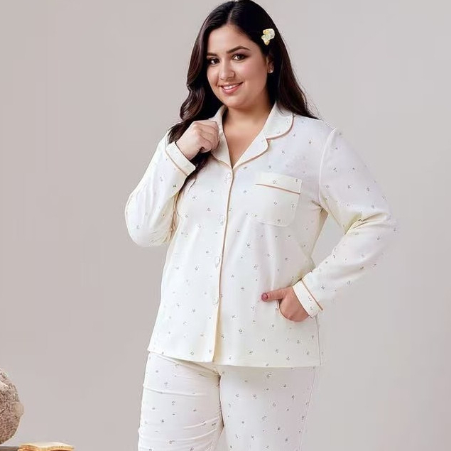 Conjunto de pijama feminino plus size, manga comprida, estilo confortável para o outono.