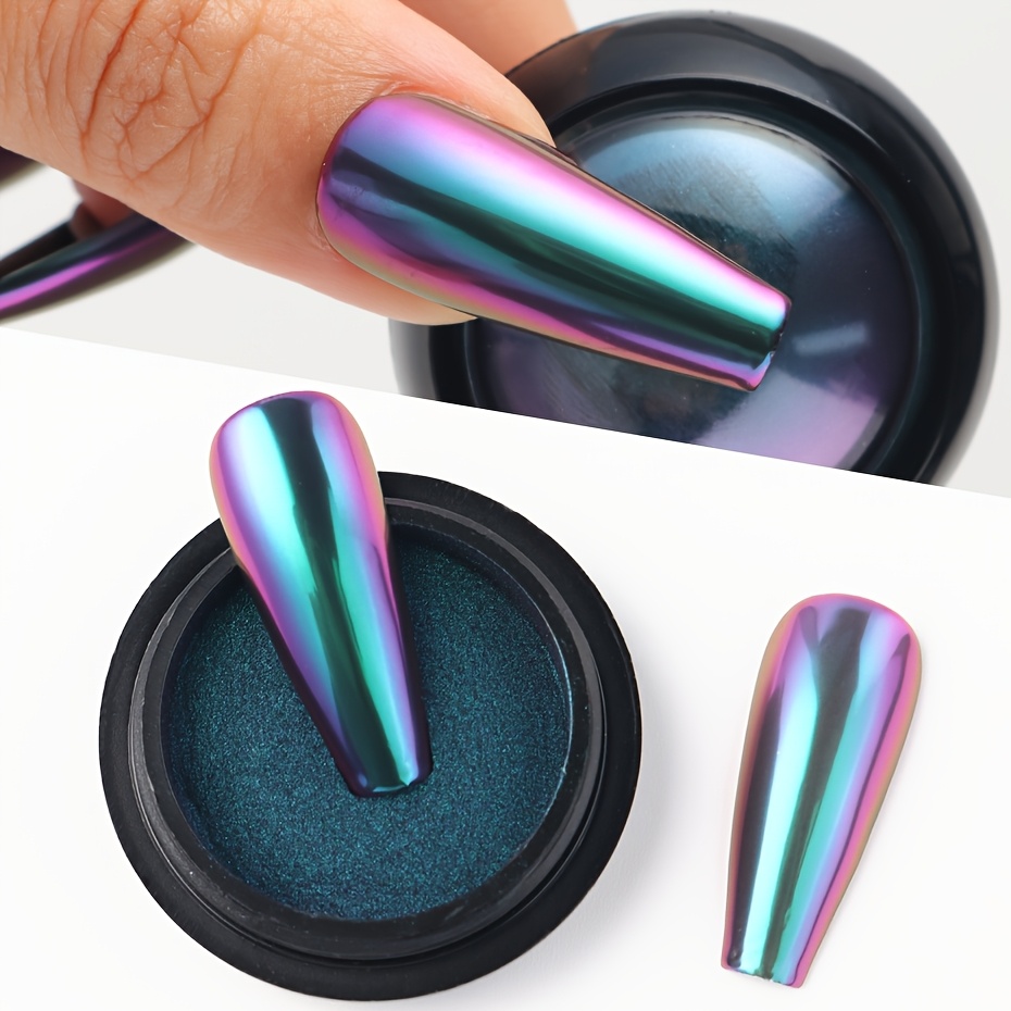 Este pó de espelho camaleão é uma verdadeira "mestra da ilusão" no mundo da nail art. Ele apresenta uma transição mágica de cores, do verde escuro intenso ao roxo-azulado misterioso, culminando em um dourado-vermelho brilhante, conforme a luz e o ângulo mudam. As unhas stiletto longas mostradas na imagem, sob diferentes iluminações, exibem um visual que varia do metálico azul-esverdeado sofisticado ao brilho quente roxo-avermelhado, como se tivessem vida própria, repletas de mistério e fantasia. Este pó de espelho é perfeito para criar unhas personalizadas com uma estética futurística. Seja usado sozinho ou combinado com outras cores, ele garante que as pontas dos dedos se tornem um destaque único e atraiam todos os olhares instantaneamente.