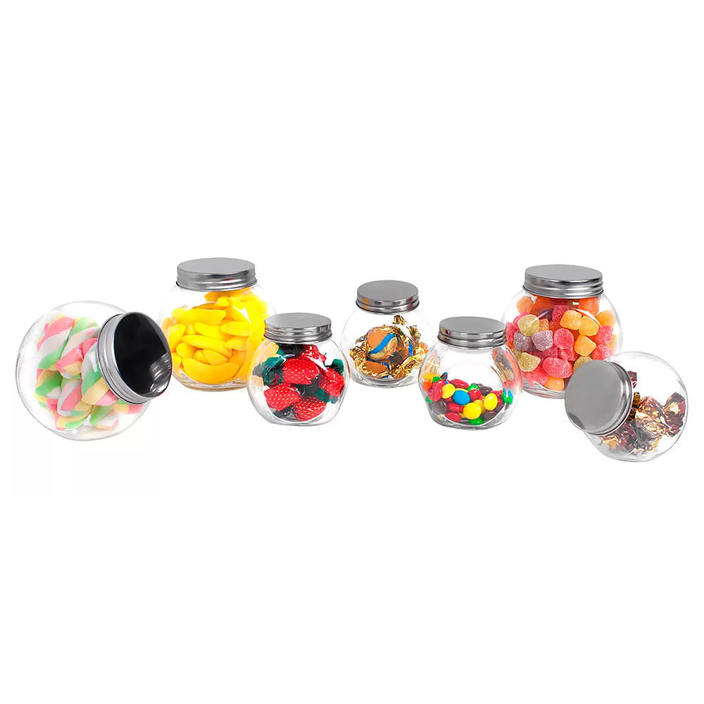 Mantenha os alimentos bem acondicionados com este lindo Conjunto de Potes Baleiro Casambiente. São sete peças fabricadas em vidro tr ansparente e aço inox, sendo quatro deles com capacidade de 210ml e três com 450ml, ideais para armazenar pequenas quantidades. Os p otes possuem formato redondo e tampa de rosquear, perfeitos para você guardar doces, salgados, petiscos e outros alimentos com prati cidade.