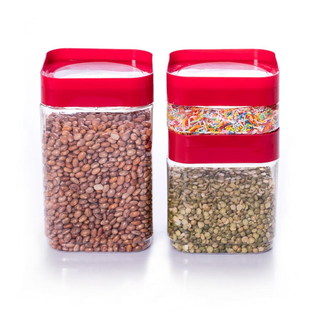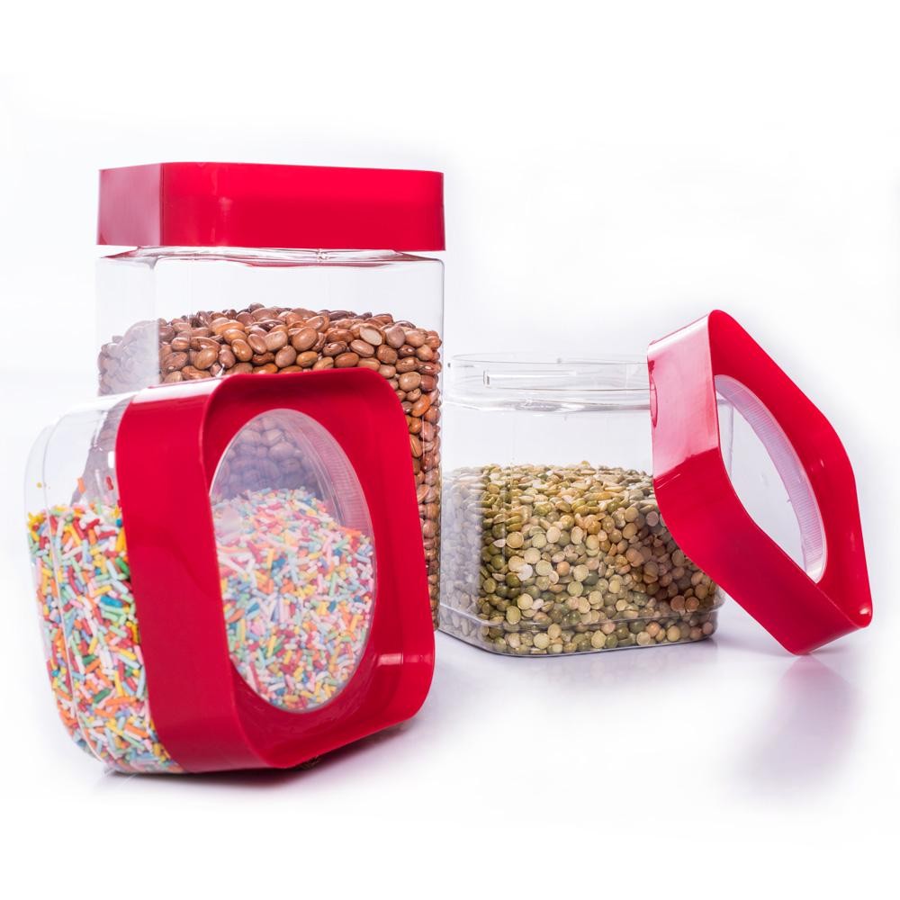 Conjunto de Potes de Plástico Quadrados com Tampa Rosca Plug Decora Vermelho 3 Peças Dimensao: (Comp x Larg x Alt): 28,5x16,0x22,5 cm - Os potes da linha Plug são incríveis para você organizar sua despensa. - Modular e empilháveis: encaixe perfeito. - Otimiza espaço nos armários. - Tampa com visor que facilita identificação do conteúdo em gavetas. - Fechamento rosca: conserva e protege os alimentos. - Super transparente. - Fabricado em PET e livre de BPA (bisfenol - A). - Não pode ser levado ao micro-ondas. - Não pode ser lavado em lava-louças. - Não pode ser esterilizado com água quente. - Pode ser levado ao freezer. - Composto por: 1 x 12939 - Pote de Plástico Quadrado 2 L Tampa Rosca Plug Decora Vermelho | 11,7 x 11,7 x 19,1 cm. 1 x 12935 - Pote de Plástico Quadrado 1,28 L Tampa Rosca Plug Decora Vermelho | 11,7 x 11,7 x 13,2 cm. 1 x 12887 - Pote de Plástico Quadrado 510 ml com Tampa Rosca Plug Decora Vermelho | 11,7 x 11,7 x 7,2 cm..