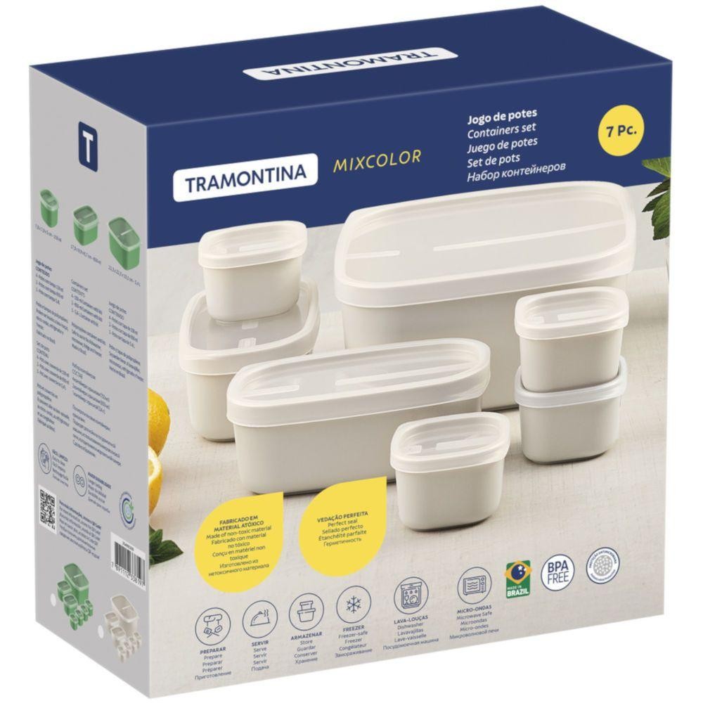 Marca:Tramontina Material:Polipropileno Pode ir ao microondas:Sim Pode ir à lava-louça:Sim Possui trava:Não Registro INMETRO:N/A Peso (kg):0.745 Referência:25499/309 Dimensões (AxLxP):- 4 potes 150ml (5,1x7,9x7,9cm) - 2 potes 650ml (6,7x10x17,9cm) - 1 pote 3,4L (10,2x22,2x22,2cm) Itens Inclusos:- 1 Conjunto de Potes Tramontina MixColor 7 Peças - 1 Manual do Produto Informações importantes:Imagens meramente ilustrativas.Objetos que ambientam as fotos não acompanham o produto.As tonalidades das cores dos produtos podem sofrer alterações de acordo com a calibração do seu monitor.Este produto não inclui montagem e instalação.Não nos responsabilizamos,no ato da entrega,por desmontagens,subir escadas,elevadores ou transporte por guincho para apartamentos.Eventuais despesas são de responsabilidade do cliente. Garantia Fabricante:3 meses