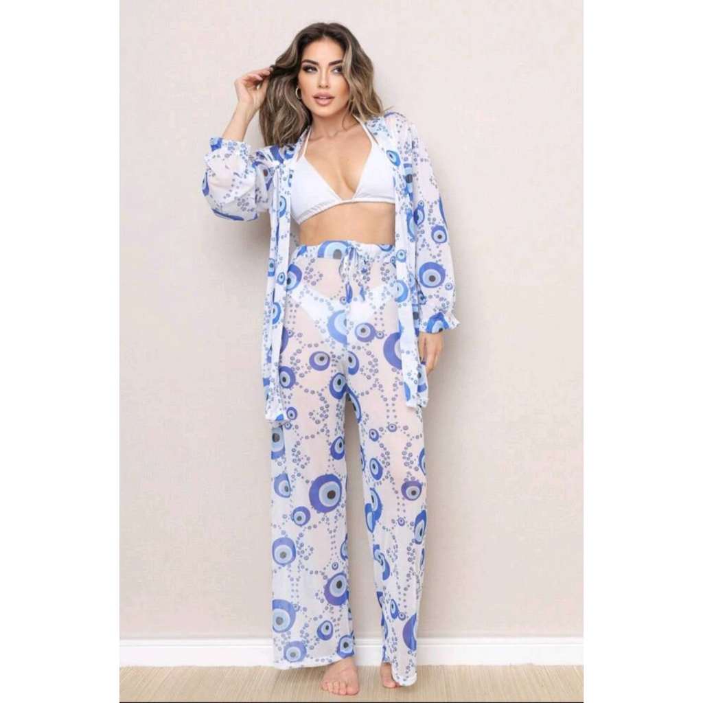 conjunto de praia tule estampado blusa e calça 4455