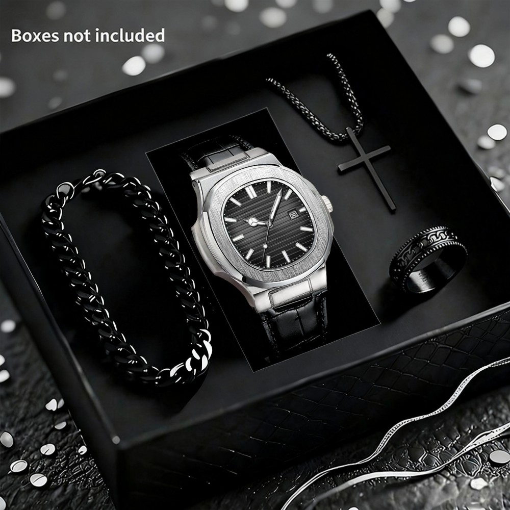 Conjunto De Relógio Digital De Quatro Peças Para Homens : De Quartzo De Luxo + Corrente Cubana + Colar Cruzado + Anel ,