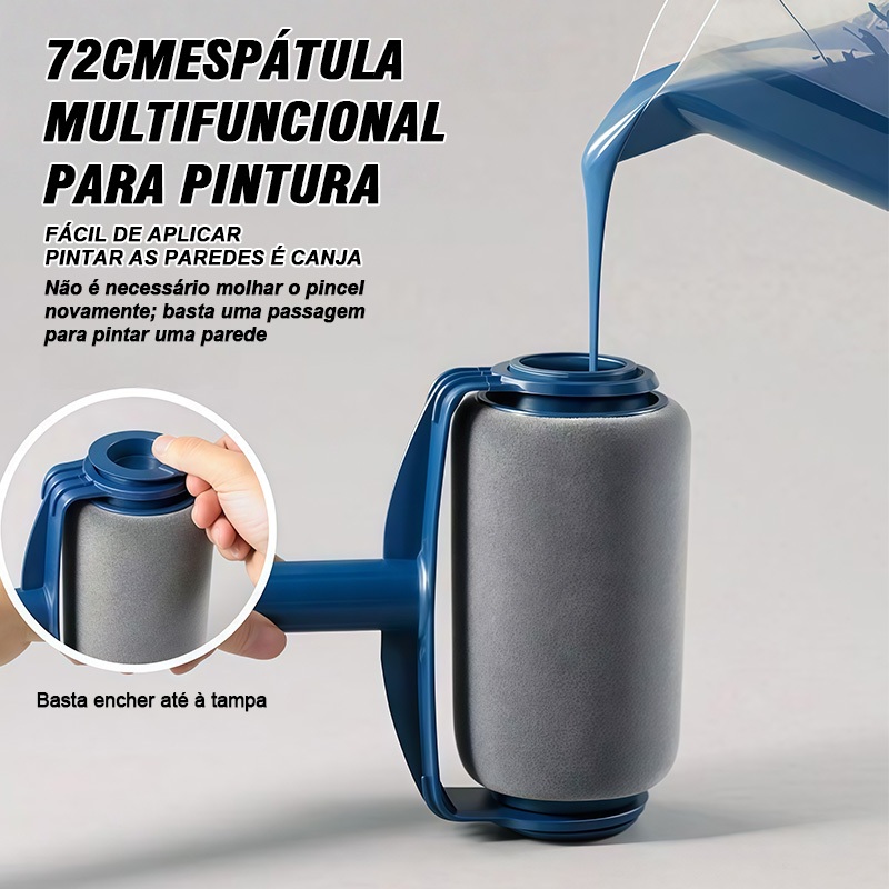 Não molha, não pinga, não suja Economia de custos — menor consumo de tinta Redução do tempo gasto a subir e descer escadas Menos esforço — já não é necessário inclinar-se para molhar o rolo Cobertura mais rápida e uniforme de áreas maiores — resultados perfeitos em superfícies rugosas ou lisas Maior comodidade — não é necessário deslocar frequentemente o recipiente de tinta Rolo autônomo recarregável — capacidade para até 1 litro de tinta Lavável (apenas tintas à base de água) — limpeza fácil Rolo com bordas felpudas e almofadas para cantos — pintar as bordas nunca foi tão limpo e fácil Sistema de distribuição patenteado com cabeça de pincel de microfibra sem costuras — proporciona uma camada uniforme que os produtos de imitação não conseguem reproduzir Adaptador para haste Paint Runner — para tetos e paredes altas, pode utilizar uma haste roscada para ampliar o alcance de trabalho; se não tiver uma haste roscada, também pode utilizar um cabo de vassoura padrão Precauções: 1. Encha o reservatório até 2/3 da sua capacidade. 2. Antes da primeira utilização, certifique-se de que o produto está limpo e seco. 3. Se a tinta tiver dificuldade em penetrar, recomenda-se diluí-la após a aplicação. 4. Durante a aplicação, não é necessário pintar sempre na mesma direção nem exercer pressão, para obter melhores resultados. Conteúdo da embalagem: Rolo de 6 polegadas × 1 Hastes de extensão × 3 (comprimento total de 72 cm) Atenção: Ao utilizar, exerça pressão no centro do rolo; não exerça pressão nas laterais, pois, se o fizer, o rolo poderá soltar-se facilmente.