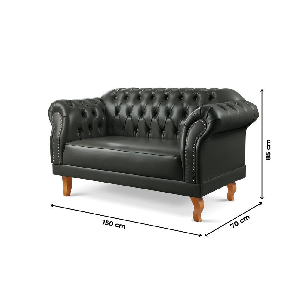O sofá Duque Chesterfield é conhecido pelo seu estilo clássico e atemporal. O seu design tradicional perdurou ao longo dos anos e continua a ser uma escolha de decoração. Se adapta bem a diversos estilos, do tradicional ao moderno. Por ser uma peça artesanal, feita à mão, é considerada uma obra de arte única. Possui a estrutura em eucalipto tratado, seco e imunizado, travamento da estrutura por grampos fixados com grampeadores pneumáticos. Espuma D28 - 8 cm para o assento e espuma D28 - 5 cm para o encosto e braços. Tornando um produto de longa durabilidade. Estilo: Clássico Peso (kg): 80 Garantia: 03 Meses Altura (cm): 84 Largura (cm): 200 Possui Pés: Sim Possui Mola: Não Pet Friendly: Não Tipo de Mola: Não Possui Tipo de Sofá: Conjuntos de Sofás Altura dos Pés: 17 Modelo do Sofá: Sofá Fixo Possui Rodízio: Não Suporta Até (kg): 360 Profundidade (cm): 75 Tipo de Encosto: Fixo Altura do Encosto: 41 Origem do Produto: Nacional Ambiente Principal: Sala de Estar Firmeza do Assento: Médio Tecido Predominante: Couro Sintético Densidade do Assento: D-28 Largura do Sofá Maior: 200 Largura do Sofá Menor: 150 Material da Estrutura: Madeira Eucalipto Quantidade de Lugares: 02 e 03 Serviço Impermeabilização: 102610509 Acompanha Almofadas Extras: Não Altura do Assento até o Chão: 43 Marca: Zurc Decor Cor: Preto Cor do Produto: Preto Itens Inclusos: 2 Sofás, Manual de Instruções Cor Predominante: Preto Linha ou Coleção: Duque