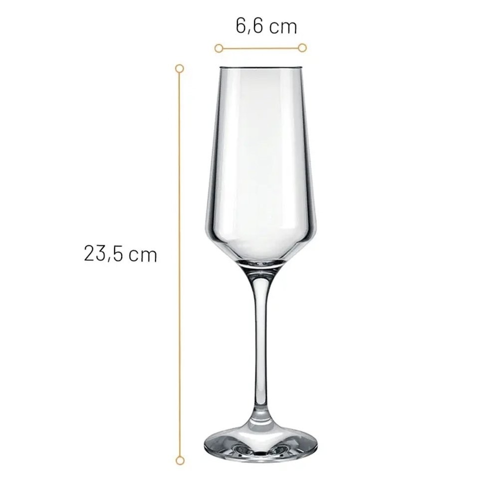 Características do Produto: Marca: Nadir Capacidade: 225m Linha: Brunello Informações Adicionais: Material do produto: Vidro cristalino transparente Indicação de uso para champanhe e vinhos espumantes Recomendações de Uso: Para limpeza, remova a sujeira com uma esponja macia, tire todo o resíduo de sabão e seque bem. Não utilize abrasivos ou utensílios pontiagudos. Submeter o vidro a mudanças bruscas de temperatura pode causar choque térmico e danificar seu produto. Evite impactos. Dimensões do Produto: LxA:6,60cm x 23,50cm Peso Unitário: 170g Fornecedor: Nadir Figueiredo Ind E Com S/A