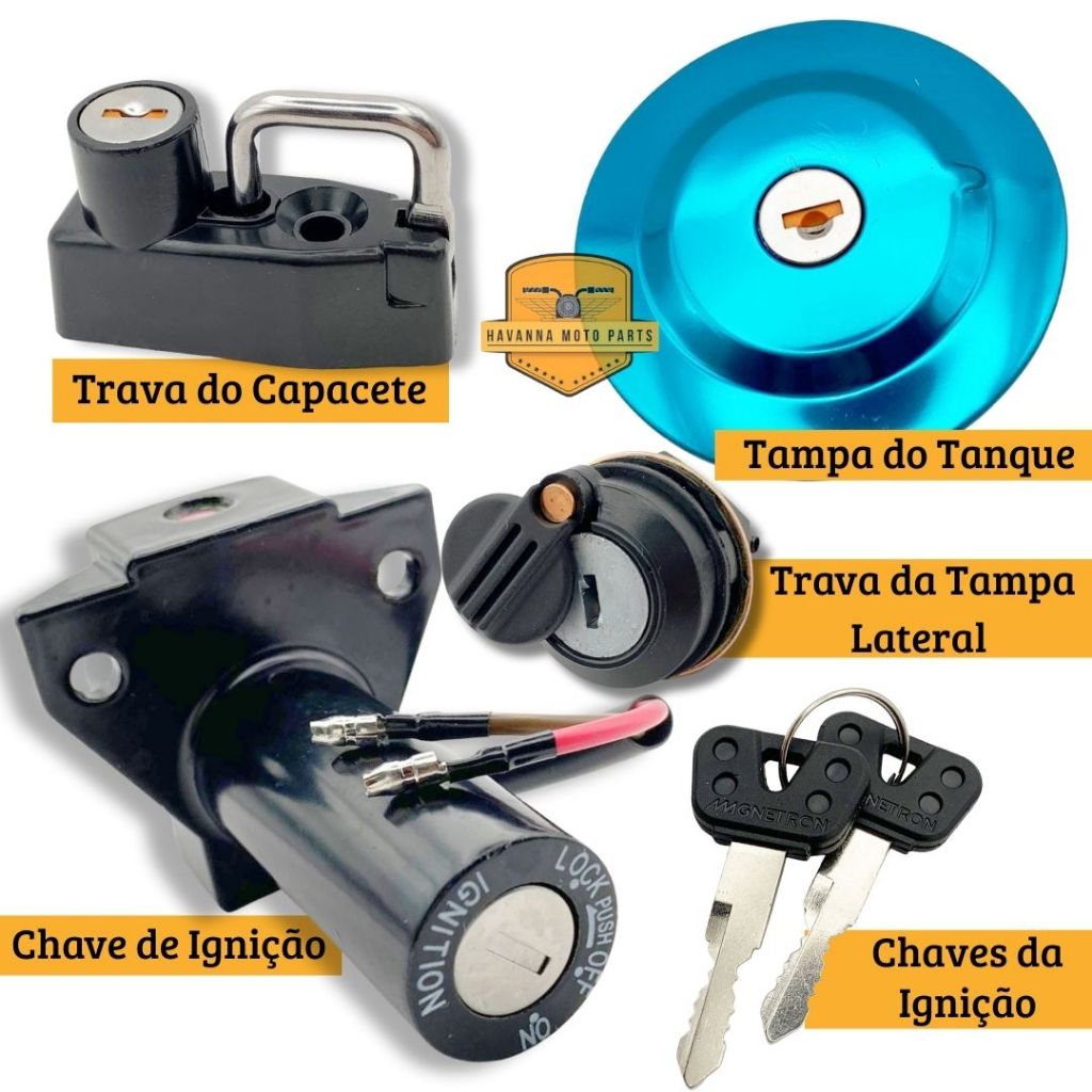 Conjunto de Travas (04 Peças) O conjunto de travas tem a função de acionar e/ou destravar, com uma única chave, vários componentes da motocicleta, como: ignição, guidão, tampa do tanque, trava de capacete e trava da tampa lateral. Compatível com: YAMAHA YBR FACTOR 125 K (2008-2013) YBR FACTOR 125 ED (2008-2013) YBR FACTOR 125 E (2008-2013) YBR 125 E (2008-2013) YBR 125 ED (2008-2013) YBR 125 K (2008-2013) Conteúdo da Embalagem: 01 Tampa do Tanque 01 Ignição 02 Chaves 01 Trava capacete 01 Trava lateral Código Original: 5LX-H2021-00 Especificações Técnicas: - Padrão de Medidas OEM - Equivalente a Peça Original - Ideal para Reposição - Alta Resistência e Durabilidade - Material leve e resistente - Excelente qualidade e acabamento Instalação: - Este produto possuí fácil instalação, não exige que mude a estrutura de sua moto, pois foi confeccionado seguindo as especificações do produto original, para encaixe e funcionamento perfeito. Vantagem: - Agora você pode desfrutar de um produto com qualidade do original, para uma melhor reposição em sua moto e com baixo custo. Características: - Produto desenvolvido com os mesmos parâmetros e encaixes do original, substituindo o mesmo sem nenhum problema ou adaptação. - Elaborado com matéria-prima de alta qualidade - Testado e aprovado dentro das normas de segurança. Importante: - Para a instalação do produto corretamente, leve ao mecânico de sua confiança! - Não nos responsabilizamos pelo uso indevido do produto