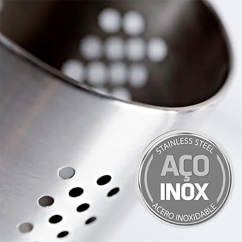 Kit de Cozinha em Aço Inox com Porta Talher Em Inox Redondo Vazado 9,5 X 12cm com Conjunto de Utensílios Descrição: O Conjunto de Cozinha totalmente feito em Aço inox é ideal para organização de sua cozinha, totalmente feitos em aço inox, garantem maior durabilidade e resistência a umidade. O Porta Talher possui formato Redondo e possui sua estrutura vazada para escorrer a agua e os utensílios são compostos por 5 itens multiuso sendo 1 Concha para Feijão; 1 Colher para Arroz; 1 Escumadeira; 1 Pegador para Massas e 1 Amassador de Batatas. Deixe agora sua cozinha mais top e organizada com este lindo Kit. Características: - Kit com 6 peças no total - Versatilidade no uso - Mais Organização - Mais durabilidade - Produtos 100% em Aço Inox Ficha Técnica: Produto: Kit de Cozinha Material: Aço Inox Nº de Peças: 06 Peças Conteúdo: - 01 Porta Talheres Organizador Redondo Vazado em Aço Inox - 01 Concha em Aço Inox - 01 Colher em Aço Inox - 01 Escumadeira em Aço Inox - 01 Pegador de Massas em Aço Inox - 01 Amassador de Batatas em Aço Inox