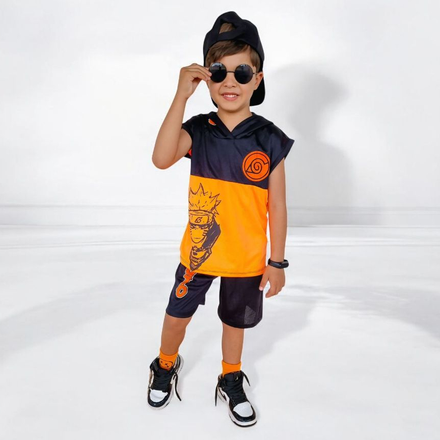 Conjunto de Verão Masculino Naruto Uzumaki Camiseta e Bermuda Fantasia Naruto