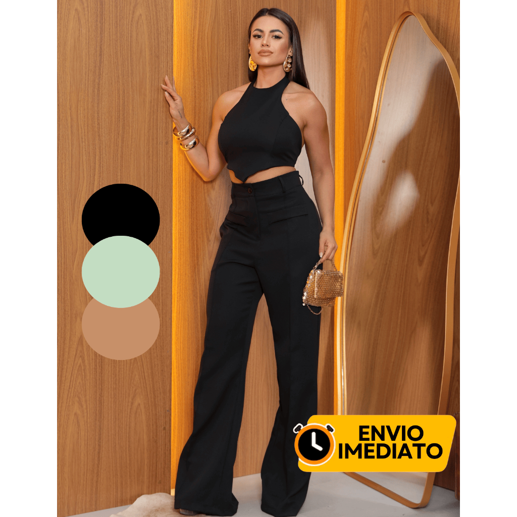 Conjunto em Alfaiataria Feminino Calça Pantalona Social Com Cropped Costas nua Elegante