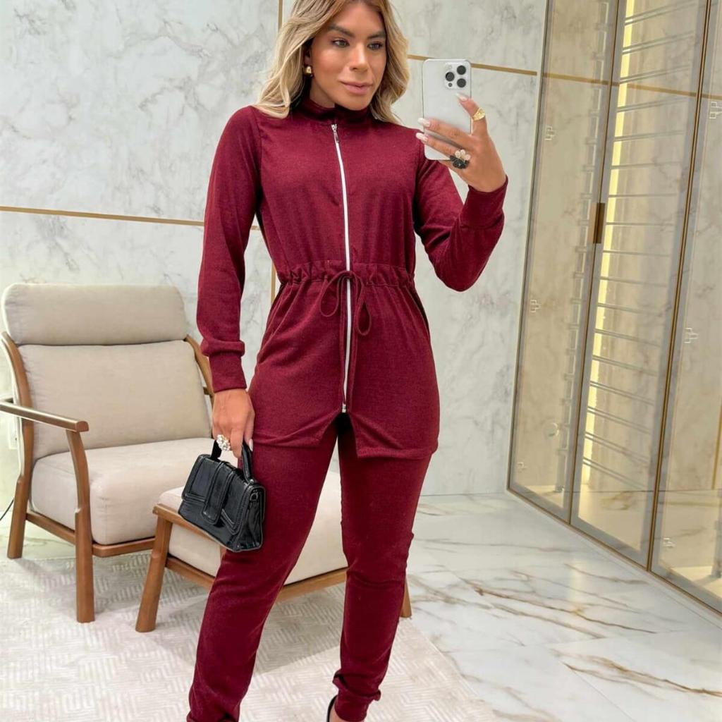 conjunto feminina com ziper calça com bolso tecido lanzinha estica