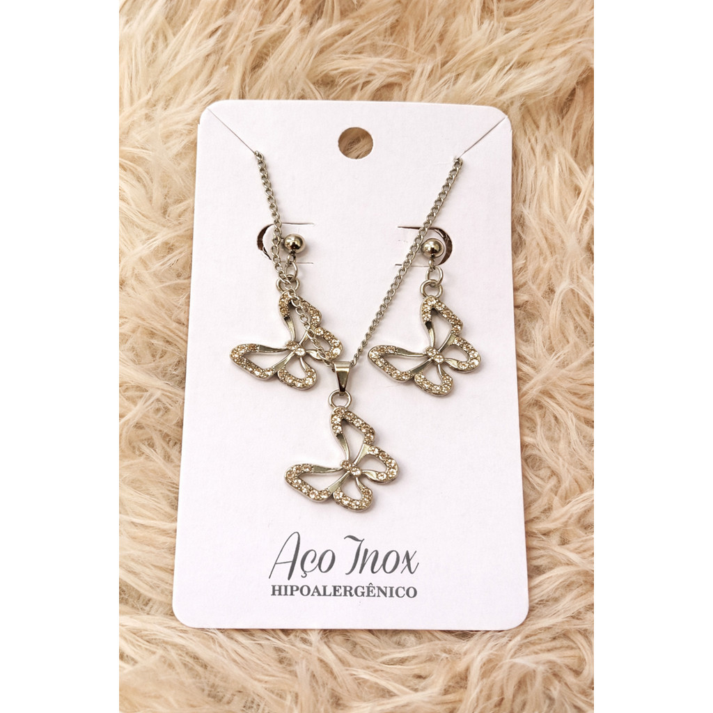 Conjunto Feminino Aço Inox | Colar + Brinco Cravejado Strass | Vários Modelos: Coração, Infinito