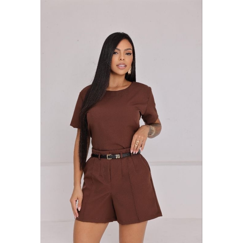Conjunto Feminino Alfaiataria Elegante – Blusa + Short com Cinto e Bolso