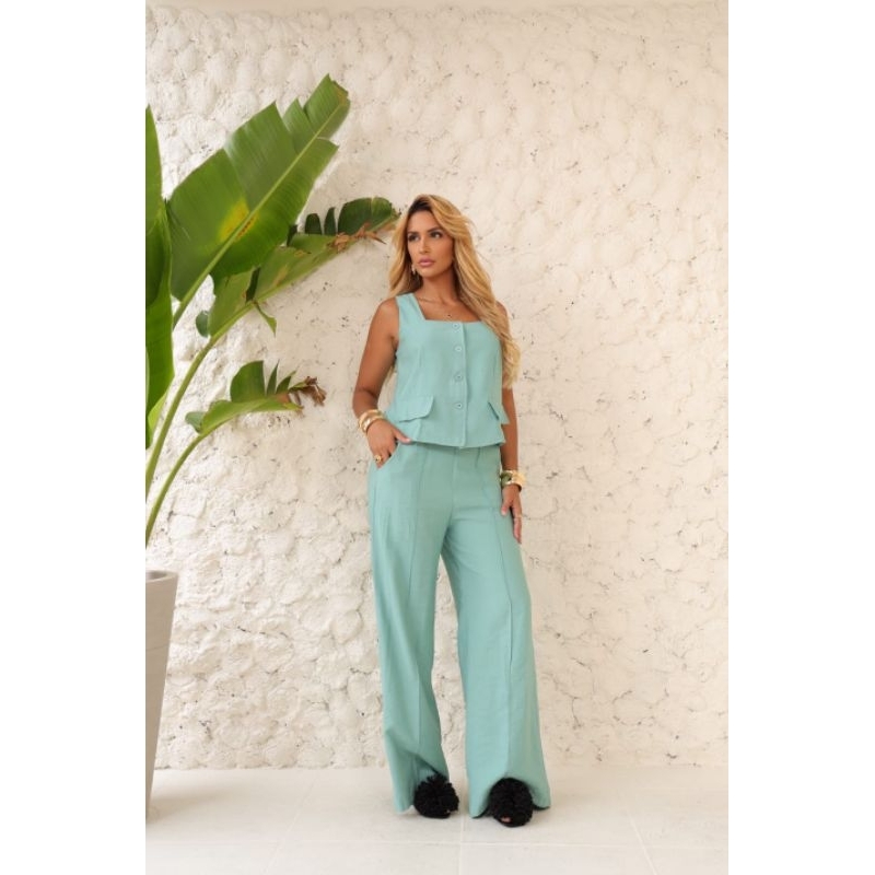 Chegou o conjunto maravilhoso material de alta qualidade em alfaiataria sensoriale ou marrant como o cliente prefere A blusa e sofisticada com detalhe caimento boa e com estilo modelo regata com botão e aberta na frente A calça tem o caimento perfeito super sofisticado pantalona 2 bolsos frontais detalhe na frente e elástico na parte traseira para melhor conforto MATERIAL 100% Algodão TAMANHOS M 38/40 G 40/42 GG 44 MEDIDAS M Busto 96 Cintura 80 Cuadril 110 G Busto 100 Cintura 84 Cuadril 114 GG Busto 104 Cintura 88 Cuadril 118 a Modela veste M altura da Modela 1.75