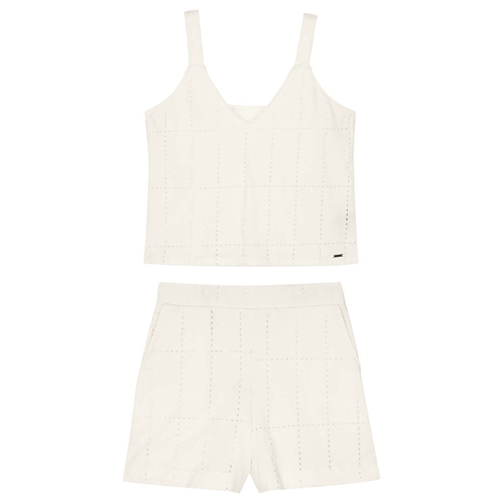 Perfeito para um visual leve, o Conjunto Marialícia é composto por regata e short em meia malha de algodão devorê. A regata possui comprimento regular, alças e decote em V, enquanto o short conta com elástico no cós e bolsos funcionais. A padronagem quadriculada com detalhes vazados em ambas as peças adicionam modernidade e charme ao look, tornando ele ideal para momentos de lazer, passeios e almoços especiais em família. Invista nesse look completo para arrasar com muita personalidade!Detalhes da peça: • Conjunto composto por regata e short • Feito em meia malha de algodão devorê • Possui comprimento regular • Possui alças com decote V • Possui elástico no cós • Possui bolsos • Possui forro • Ideal para passeios, momentos de lazer e almoços especiais Modelo veste tamanho P. Medidas da modelo: 84cm de busto; 90cm de quadril; e 63cm de cintura.