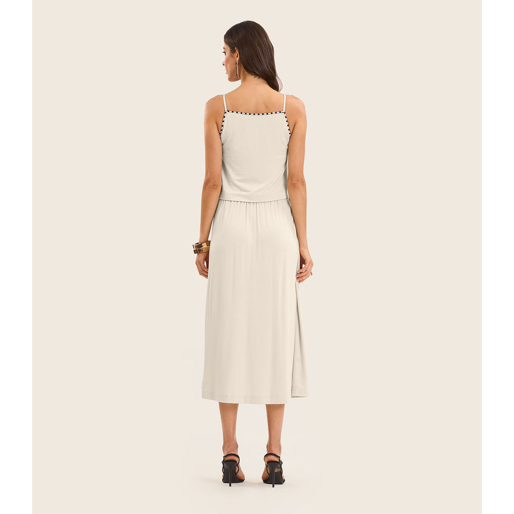 O Conjunto Feminino Blusa com Saia Midi Endless é confeccionado em visco maquinetada, oferecendo leveza e sofisticação. A blusa possui alças finas com fita de sustentação e acabamento embutido no decote e cavas, garantindo conforto e beleza. A barra tem acabamento com costura larga. A saia conta com cós com elástico interno, proporcionando ajuste perfeito ao corpo, além de aviamento embutido nas laterais que valoriza o caimento e o visual da peça. Ideal para ocasiões casuais ou mais elegantes.