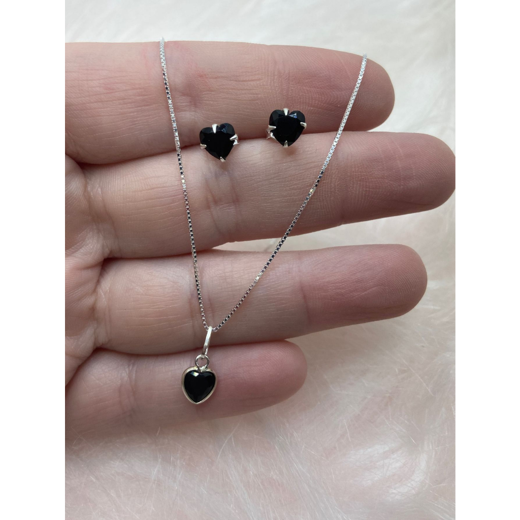 Conjunto Feminino Brinco E Colar Zircônia preta Coração