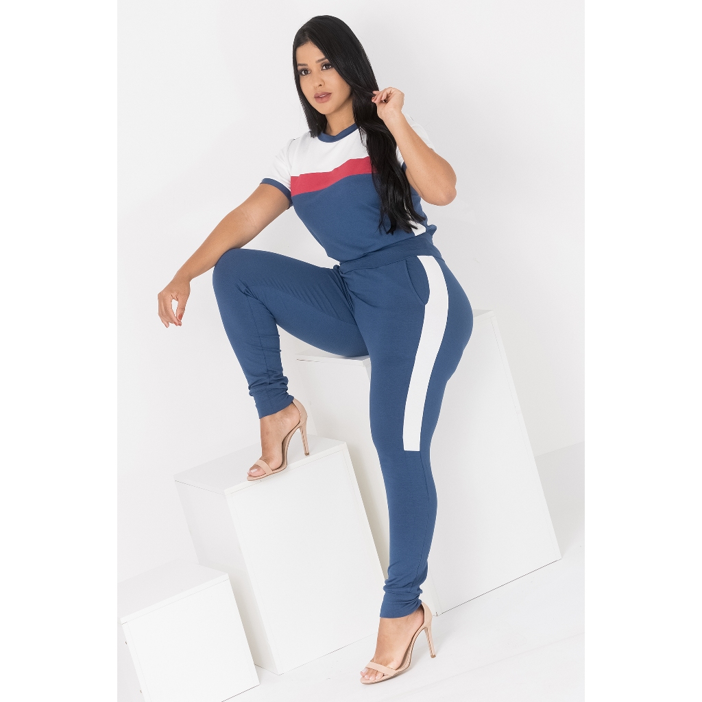 Conjunto Feminino Calça E Blusa Manga Curta Tecido Com Lycra