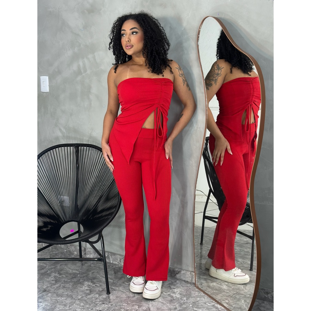 conjunto feminino calça e blusa tomara que caia assimétrica