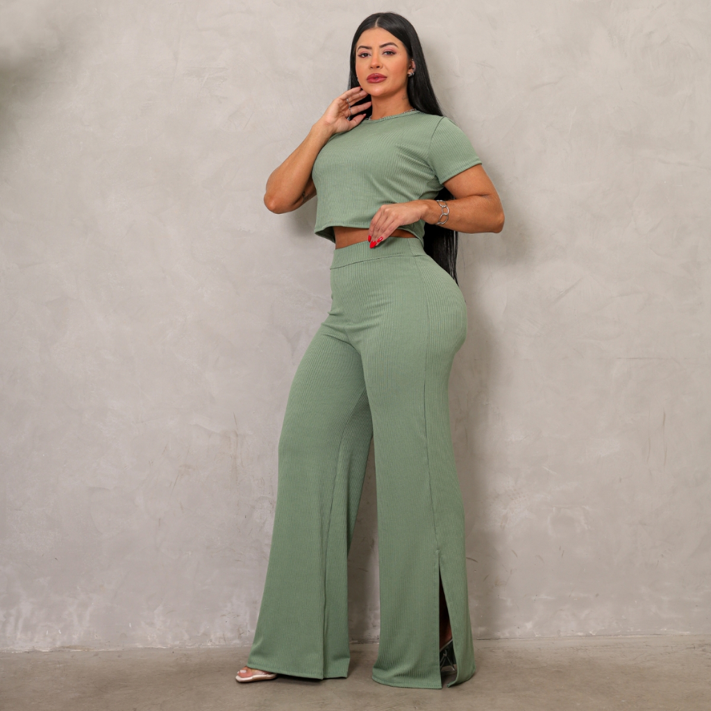 Conjunto Feminino Canelado Blusa Cropped e Calça Flare com Fenda Look Elegante Confortável Casual