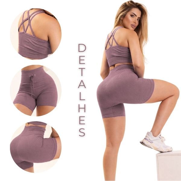 Conjunto Feminino Canelado com Short Modelador e Top de Bojo Removível Costas Cruzadas Academia Fitness Cintura Alta