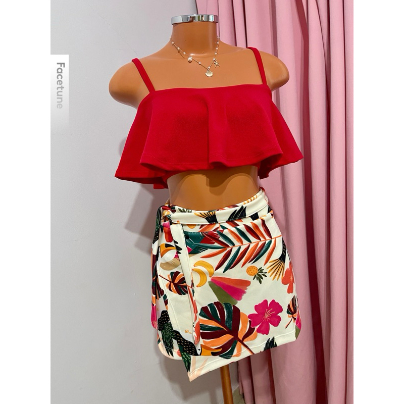 Conjunto Feminino Cropped e Short Saia 2 Peças Conjunto feminino look Réveillon roupa Natal ano novo conjunto estampado