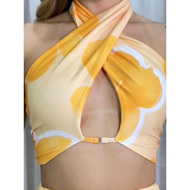 Conjunto Feminino Cropped Gola Cruzada e Saia Longa Tendência Várias Estampas Moda Verão Casual Chic