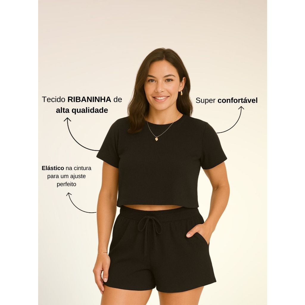 Conjunto Feminino Cropped Manga Curta e Shorts em Ribaninha Premium – Conforto e Estilo Casual | ENVIO IMEDIATO