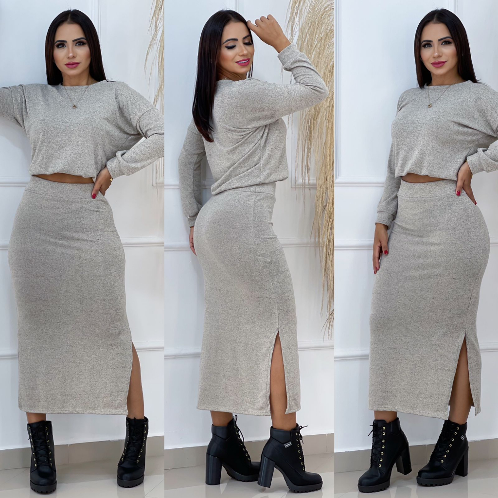 Conjunto feminino de inverno blusa cropped e saia midi lã lanzinha