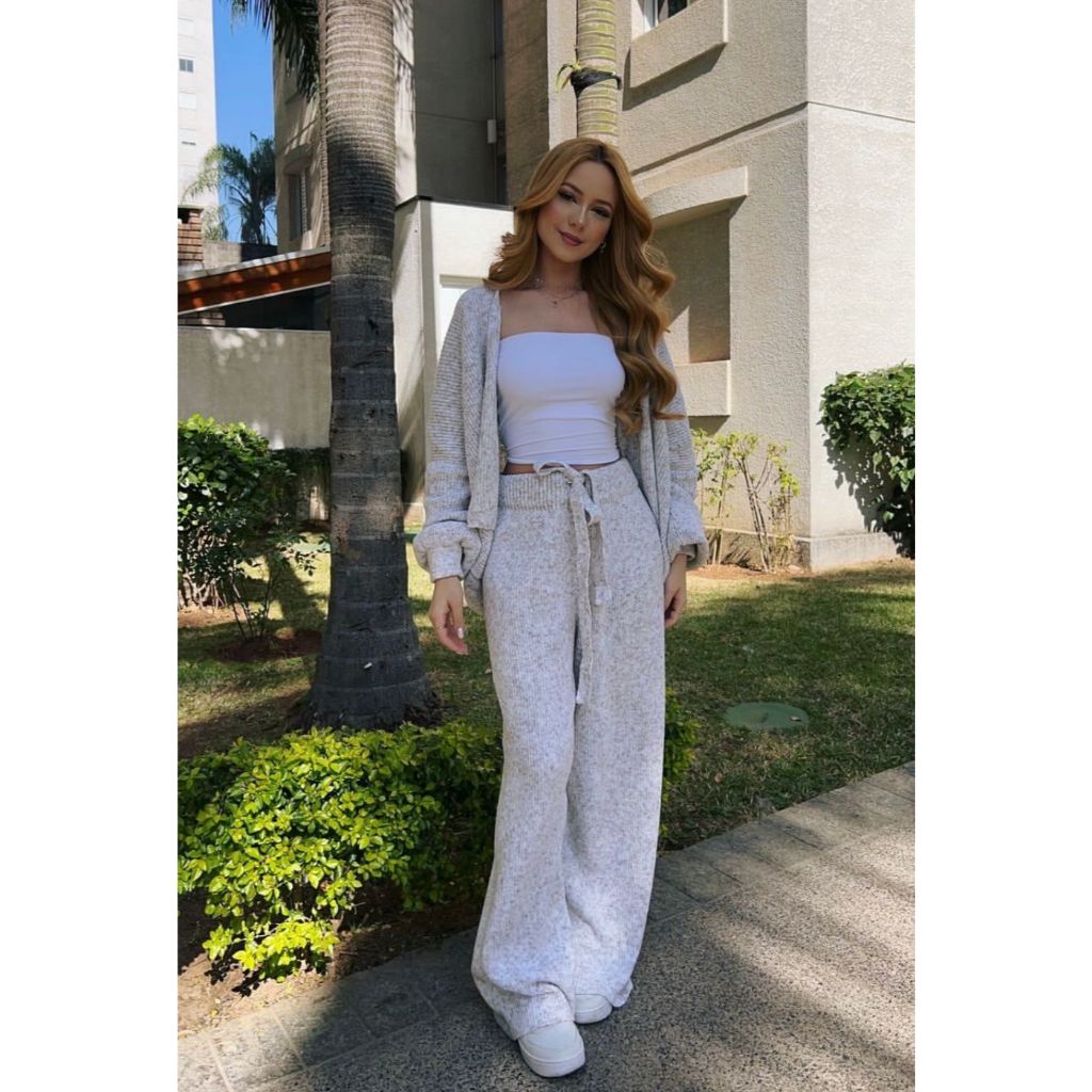 SEJA BEM-VINDO À LOJA ZIANLIKE TRICOT ÓTIMA QUALIDADE ENTREGA RÁPIDA Conjunto Feminino de Tricot Mousse Premium Casaco Cardigan e Calça Pantalona Com Amarração Tricô Fio Musse Moda Blogueira Gringa Conjunto Comfy Estiloso ** DETALHES DAS PEÇAS ** - FIO MOUSSE (Toque macio e quentinho) - Composição: 75% acrílico e 25% poliamida - Tamanho Único - Veste 38 ao 44 - Comprimento casaco: 52 cm - Comprimento calça: 104 cm ** As medidas podem variar em até 3 cm ** Dicas de como cuidar melhor, preservando as suas peças de tricot: - Lavar à mão, preferencialmente; - Utilizar sabão de coco e água na lavagem; - Evitar lavar com sabão em pó, pois a peça pode encolher e ainda endurecer a trama; - Não deixar de molho por muito tempo; - Caso a lavagem seja na máquina, selecionar o modo delicado, e colocar a peça dentro de um saquinho especifico para roupas delicadas; - Em vez de pendurar, secar deitado; - Não necessário passar; - Evitar encostar em objetos pontiagudos. ❓ Dúvidas ou mais informações? Utilize o CHAT responderemos o mais breve possível!