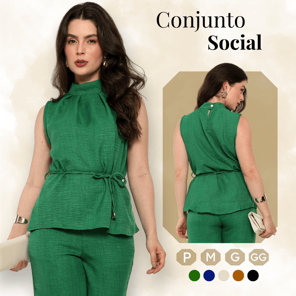 Conjunto Feminino Elegante Duna Blusa Gola Alta e Calça Pantalona Wide Leg Moda Casual Chique