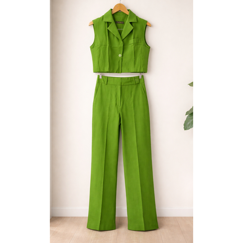 Conjunto feminino em marrant calça com bolsos cintura alta e colete com botão